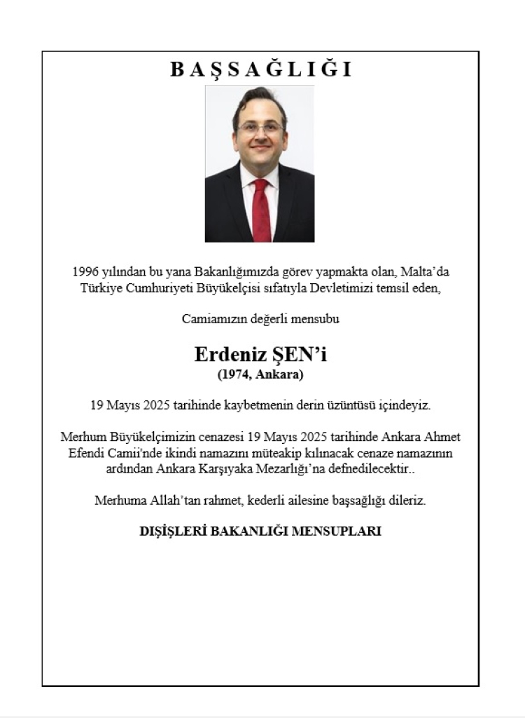 Dışişleri Bakanlığı, Malta Büyükelçisi Erdeniz Şen’in vefat ettiğini duyurdu.