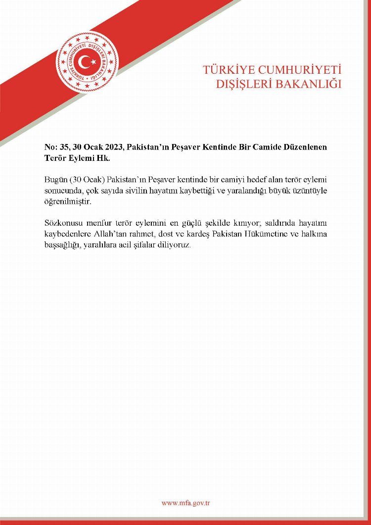 ANKARA (İGFA) –  Pakistan’ın Peşaver kentinde camiyi hedef alan terör eylemi sonucunda, çok sayıda sivilin hayatını kaybetmesi ve yaralanması ardından Türkiye, Pakistan’a taziye ve geçmiş olsun dileklerini ileterek, saldırıyı kınadı.