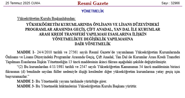 Yapılan değişiklikle, 4 Kasım 1981 tarihli ve 2547 sayılı Yükseköğretim Kanunu’nun 54. maddesinin birinci fıkrasının (d) bendinde belirtilen fiiller nedeniyle yükseköğretim kurumlarından ilişiği kesilen öğrencilerin, diğer yükseköğretim kurumlarına yatay geçiş için başvuru yapamayacağı hükme bağlandı.