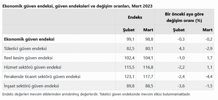 Ekonomik güven endeksi Şubat ayında 99,1 iken, Mart ayında yüzde 0,2 oranında azalarak 98,8 değerini aldı.