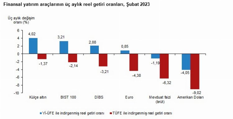 Finansal yatırım araçlarında en düşük kayıp brüt mevduat faizinde olurken, külçe altın üç aylık değerlendirmede yurtiçi üretici fiyat endeksi ile indirgendiğinde yüzde 4,02 oranında yatırımcısına en yüksek reel getiri sağlayan yatırım aracı oldu.