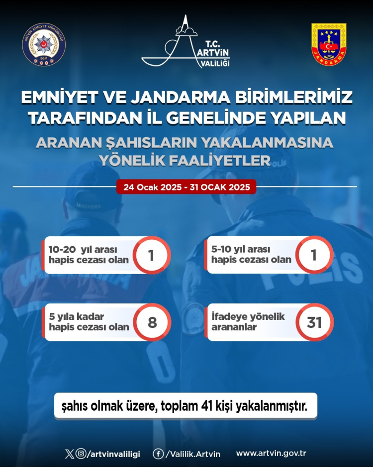 Artvin’de bir haftada farklı suçlardan aranan 41 kişi yakalandı.