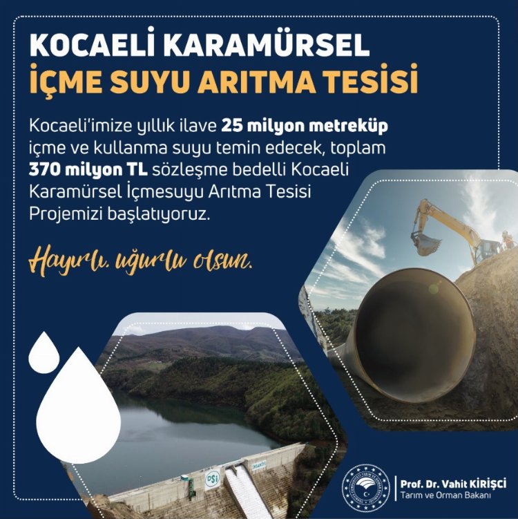 2025 Yılı içerisinde devreye alınması planlanan Karamürsel ve Gölcük ilçelerinin su ihtiyacını karşılayacak olan Karamürsel İhsaniye Barajı’nın İçme Suyu Arıtma Tesisinin de çalışmaları başlıyor. Tarım ve Orman Bakanı Vahit Kirişçi Twitter hesabından yaptığı açıklamada İhsaniye Barajı’nın İçme Suyu Arıtma Tesisi çalışmalarına 370 milyon TL sözleşme bedelli proje ile başlayacaklarını müjdeledi.