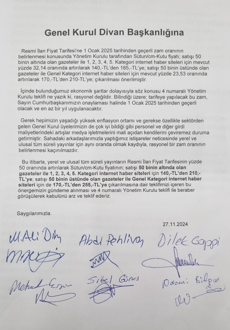 Bu itibarla, yerel ve ulusal tüm süreli yayınların Resmi İlan Fiyat Tarifesinin yüzde 50 oranında artırılarak Sütun/cm-Kutu fiyatının; satışı 50 binin altında olan gazeteler ile 1, 2, 3, 4, 5. Kategori internet haber siteleri için 140,-TL’den 210,-TL’ye; satışı 50 binin üstünde olan gazeteler ile Genel Kategori internet haber siteleri için de 170,-TL’den 255,-TL’ye çıkarılmasına dair teklifimizi içeren bu önergemizin gündeme alınması ve 4 numaralı Yönetim Kurulu teklifi ile beraber görüşülerek kabülünü arz ve teklif ederiz.