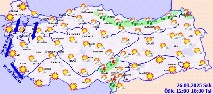 ANKARA (İGFA) – Meteoroloji Genel Müdürlüğü, 26 Ağustos 2025 tarihli hava durumu raporunu yayımladı. Buna göre, Türkiye’nin kuzey kesimleri ile Doğu Akdeniz’de parçalı ve yer yer çok bulutlu bir hava bekleniyor.