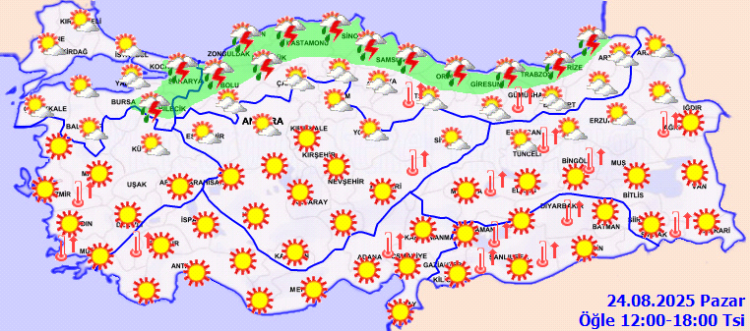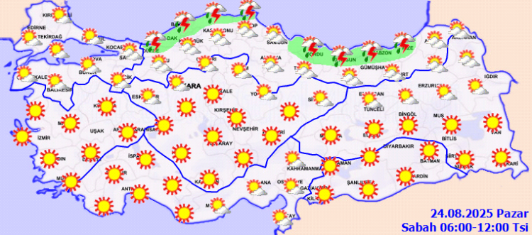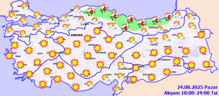 Meteoroloji Genel Müdürlüğü’nün 24 Ağustos tarihli değerlendirmesine göre, Türkiye’nin kuzey kesimleri ile Doğu Akdeniz’de parçalı ve yer yer çok bulutlu hava etkili olacak.