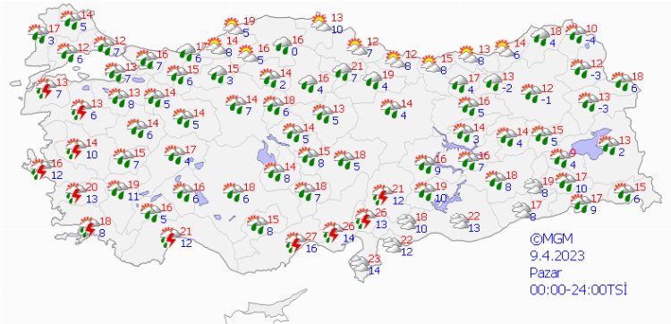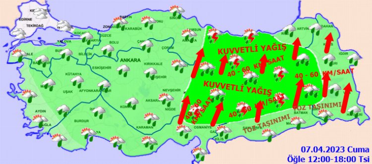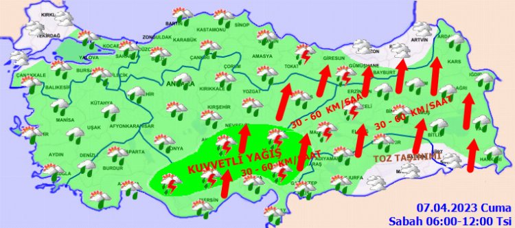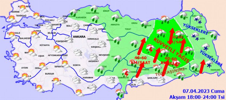 Yağışların genellikle yağmur ve sağanak, yer yer gök gürültülü sağanak, Doğu Anadolu’nun kuzey ve doğusunun yükseklerinde karla karışık yağmur ve kar şeklinde olmak üzere; Doğu Anadolu’nun batısı, Kahramanmaraş, Karaman, Niğde, Kayseri, Sivas, Ordu, Giresun, Trabzon, Tokat, Gümüşhane, Bayburt, Erzurum, Ağrı, Muş, Bitlis, Adıyaman ve Diyarbakır çevreleri ile Adana ve Osmaniye’nin kuzey kesimlerinde yerel olarak kuvvetli olması bekleniyor.