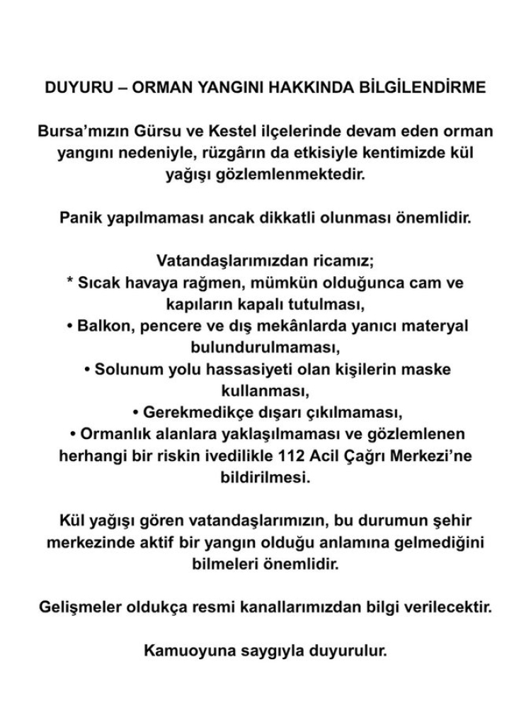 Bursa Büyükşehir Belediyesi, Bursa’nın Gürsu ve Kestel ilçelerindeki yangınlarının Bursa’da kül yağışına neden olduğunu duyurdu.