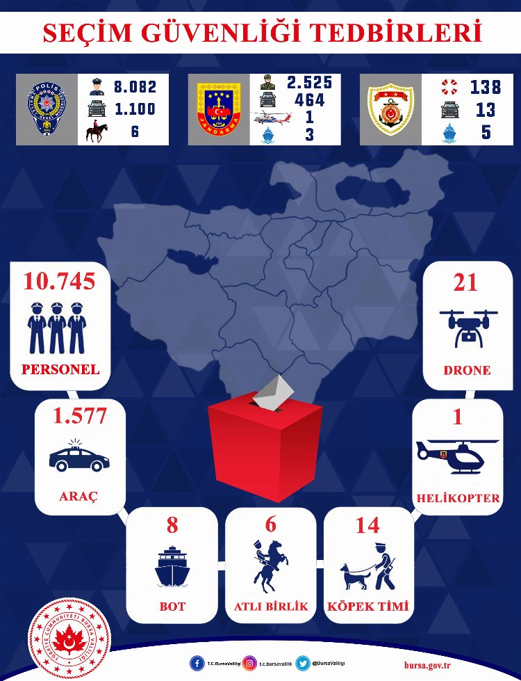 Seçim güvenliği tedbirleri kapsamında Bursa İl Emniyet Müdürlüğü’nden 8 bin 82 personel ve bin 100 araç, İl Jandarma Komutanlığı’ndan 2 bin 525 personel, 464 araç, 1 helikopter ve 3 bot, Sahil Güvenlik Komutanlığı’ndan 138 personel, 13 araç ve 5 bot olmak üzere toplamda 10 bin 745 personel ve bin 588 araç/bot, 1 helikopter, 6 atlı birlik, 14 köpek timi ve 21 drone ile seçim güvenliği çerçevesinde görev yapıyor.
