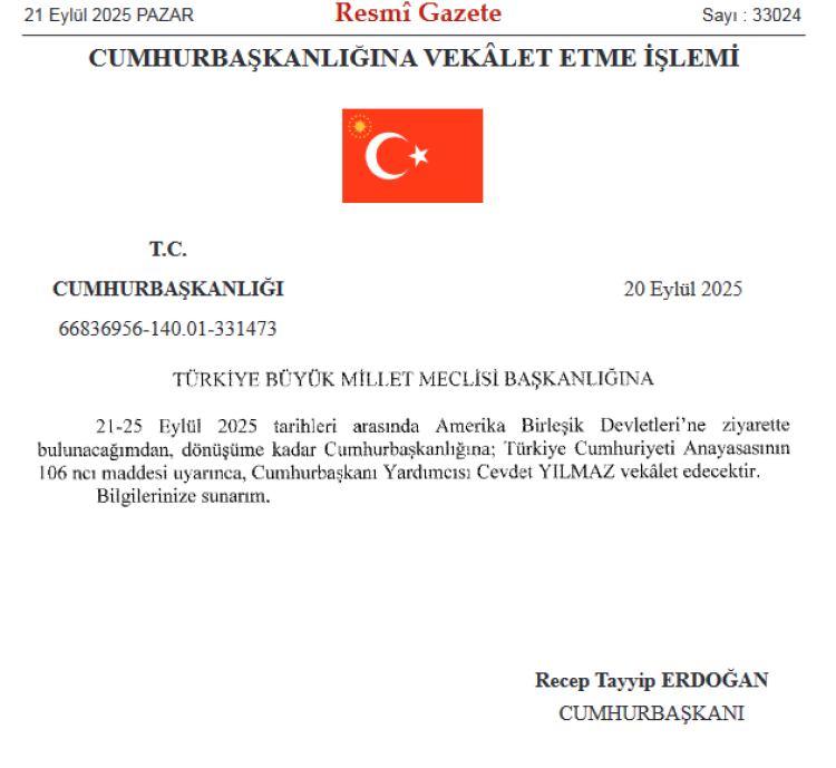 Tezkereye göre, 21-25 Eylül tarihleri arasında Amerika Birleşik Devletleri’ne ziyarette bulunacak Cumhurbaşkanı Recep Tayyip Erdoğan’ın dönüşüne kadar, Cumhurbaşkanlığına, Anayasa’nın 106’ncı maddesi uyarınca Cumhurbaşkanı YardımcısıCevdet Yılmaz vekalet edeceği kaydedildi.