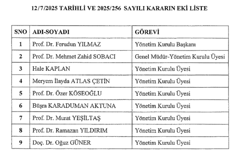 Karar kapsamında, Türkiye Radyo-Televizyon Kurumu (TRT)’na yeni atamalarda mevcut Genel Müdür Prof. Dr. Mehmet Zahid Sobacı yeniden bu göreve atanırken, TRT Yönetim Kurulu Başkanlığı’na ise, Bursa Uludağ Üniversitesi Rektörü Prof. Dr. Ferudun Yılmaz getirildi. Prof. Dr. Yılmaz başkanlığındaki TRT Yönetim Kurulu’nda Prof. Dr. Mehmet Zahid Sobacı, Hale Kaplan, Meryem İlayda Atlas Çetin, Prof. Dr. Özer Köseoğlu, Büşra Karaduman Aktuna, Prof. Dr. Murat Yeşiltaş, Prof. Dr. Ramazan Yıldırım üye olarak görev aldı.