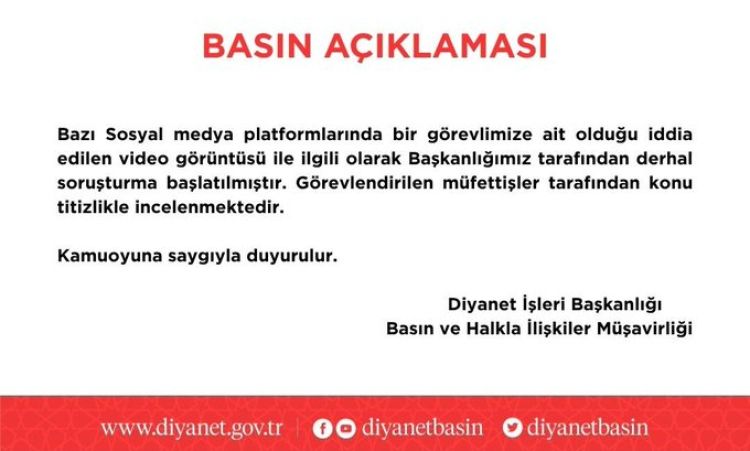 Diyanet İşleri Başkanlığı, bir personeline ait olduğu iddia edilen sosyal medya videosuyla ilgili soruşturma başlatıldığını duyurdu. Müfettişlerin görevlendirildiğini ve konunun titizlikle incelendiğini belirten Başkanlık, kamuoyunu bilgilendirdi.