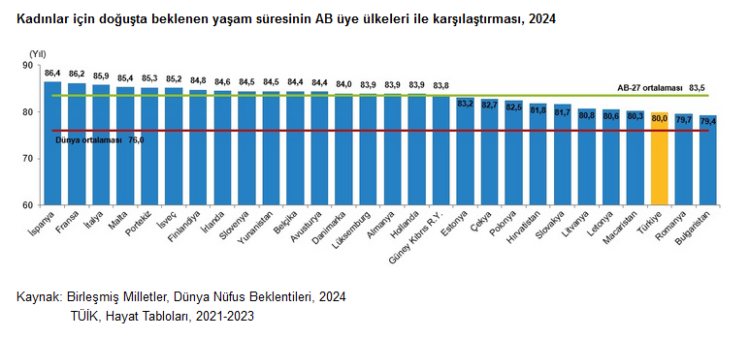 Erkeklerde Monako 84,6 yıl, kadınlarda Monako 88,6 yıl ile en uzun yaşam süresine sahip. Türkiye’de erkekler 74,7 yıl, kadınlar 80,0 yıl ile dünya ortalamalarının (70,7 ve 76,0) üzerinde. Ancak AB’de İtalya (81,8) ve İspanya (86,4) Türkiye’yi geçiyor.