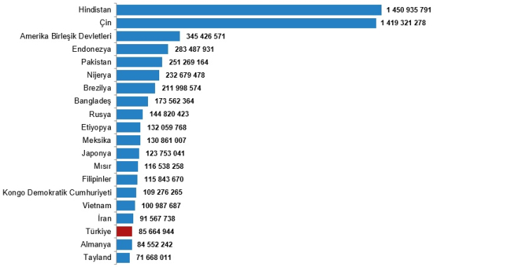 Türkiye ise 85,6 milyon nüfusla 194 ülke arasında 18. sırada yer alarak dünya nüfusunun yüzde 1’ini temsil ediyor.