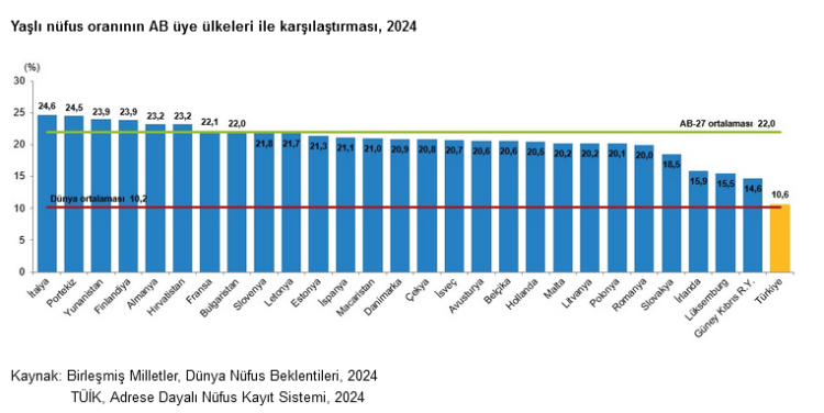 Yaşlı nüfus oranı en yüksek ülke yüzde 36,2 ile Monako, Türkiye’de ise yüzde 10,6 ile dünya ortalaması (yüzde 10,2)’nın biraz üzerinde, ancak AB ortalamasından (yüzde 14,6-24,6) düşük. Doğurganlıkta Çad 6,03 çocukla zirvedeyken, Türkiye 1,48 çocukla dünya ortalaması (2,25)’nın altında, ancak AB ortalamasından (1,11-1,75) yüksek.