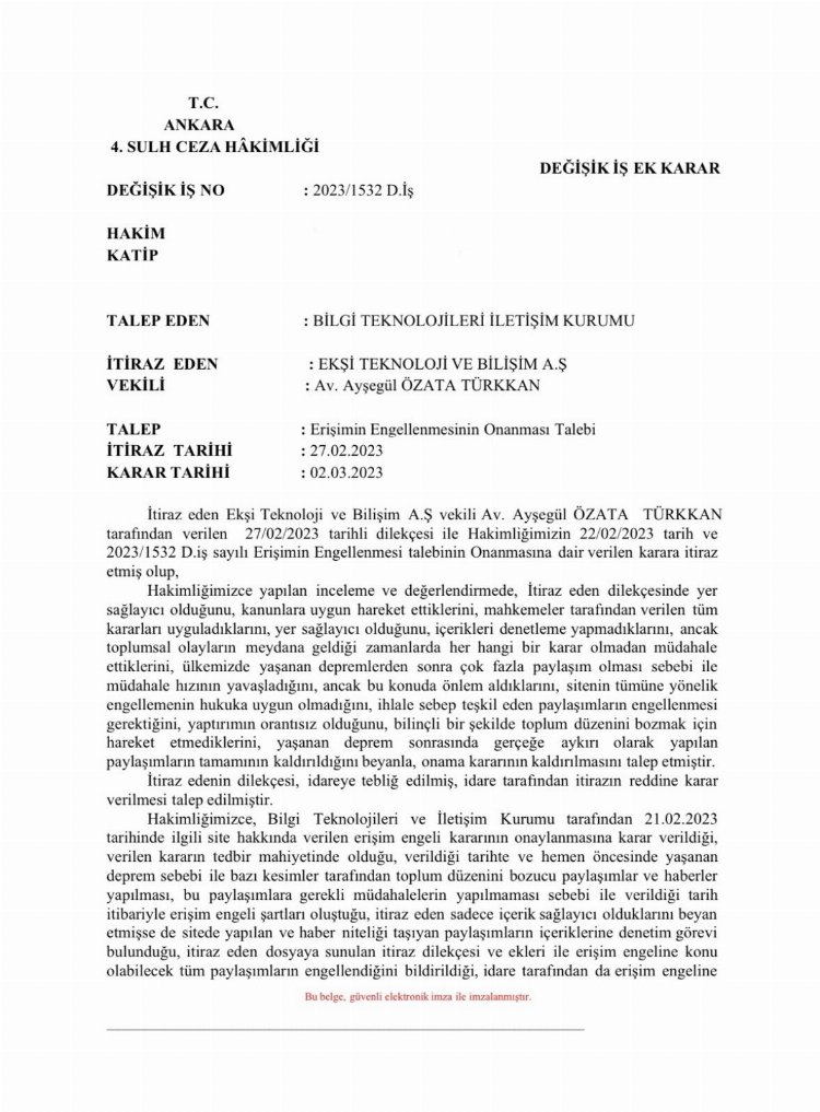 Hatırlanacağı gibi, 21 Şubat’ta Ekşi Sözlük’e Bilgi Teknolojileri ve İletişim Kurumu (BTK) tarafından erişim engeli getirilmişti.