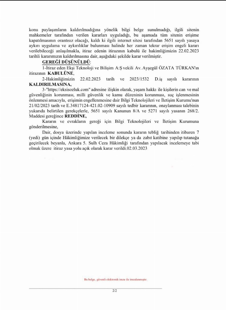 O sırada BTK ile görüşme yapıldığını kaydeden Ekşi Sözlük, karara dayanak olarak herhangi bir içeriğin gösterilmediğini ifade etmişti.