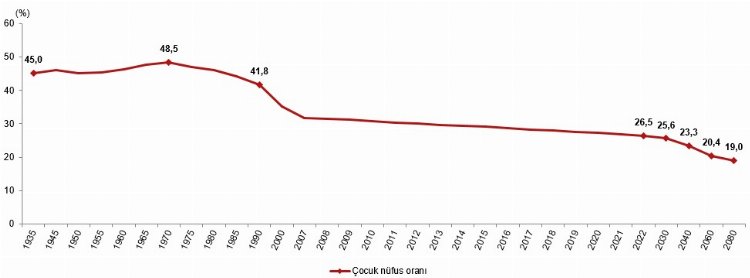 Nüfus projeksiyonlarına göre çocuk nüfus oranının 2030 yılında yüzde 25,6, 2040 yılında yüzde 23,3, 2060 yılında yüzde 20,4 ve 2080 yılında yüzde 19,0 olacağı öngörüldü.