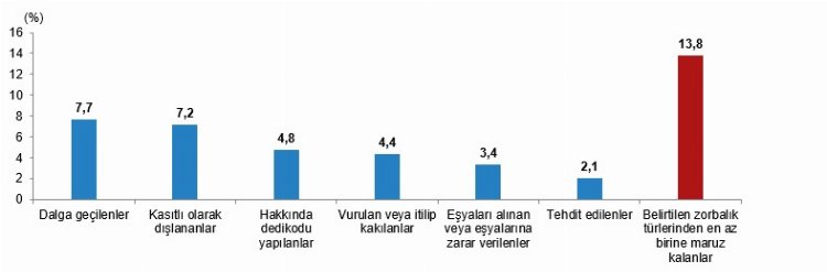 Zorbalık türlerine göre diğer çocuklar tarafından zorbalığa uğrayan 6-17 yaş grubundaki çocukların oranı, 2022 yılında tabloya şöyle yansıdı: