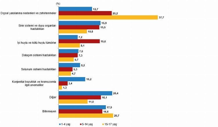 Ölüm ve ölüm nedeni istatistiklerine göre 2021 yılında 1-17 yaş grubunda en fazla çocuk ölümleri, dışsal yaralanma ve zehirlenmeler nedeniyle gerçekleşti. Bebek ölüm hızı binde 9,2 oldu.