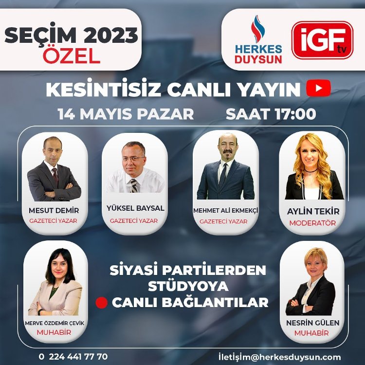 100 yılın seçimi olan 14 Mayıs 2023 seçim heyecanı, İGF TV ve Herkes Duysun TV ortak yayınıyla İGF Haber Ajansı üyesi tüm medyalarda saat 17.00’den itibaren kesintisiz sürecek özel canlı yayınla internet ekranlarında yaşanacak.