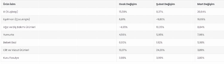 Yaşam maliyetini oluşturan ürünler arasında hanelerin sık kullandığı bazı ürünlerin aylık fiyat değişim oranları tabloya şöyle yansıdı: