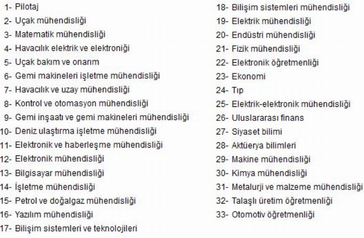 TÜİK’e göre lisans mezunları arasında aylık ortalama kazancı en yüksek olan beş bölüm sırasıyla; pilotaj, uçak mühendisliği, matematik mühendisliği, havacılık elektrik ve elektroniği, uçak bakım ve onarım oldu.