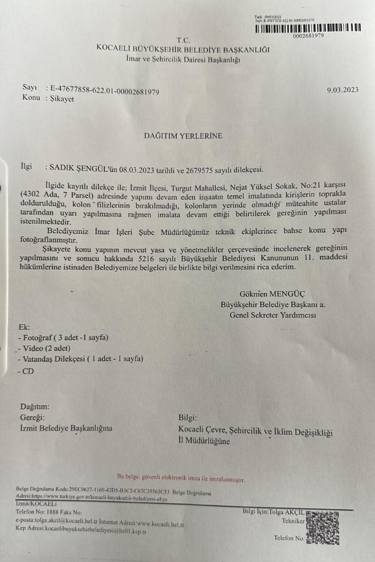 Açıklamada, “Kocaeli Büyükşehir Belediyesi tarafından İzmit Belediyesi’ne ‘’şikayete konu yapının mevcut yasa ve yönetmelikler çerçevesinde incelenerek, gereğinin yapılması ve sonucu hakkında 6216 Sayılı Büyükşehir Belediyesi Kanunun 11. maddesi hükümlerine istinaden Büyükşehir Belediyesi’ne bilgi verilmesi yönünde 09.03.2023 tarih ve 2681979 sayılı resmi yazı gönderilmiştir” denildi.