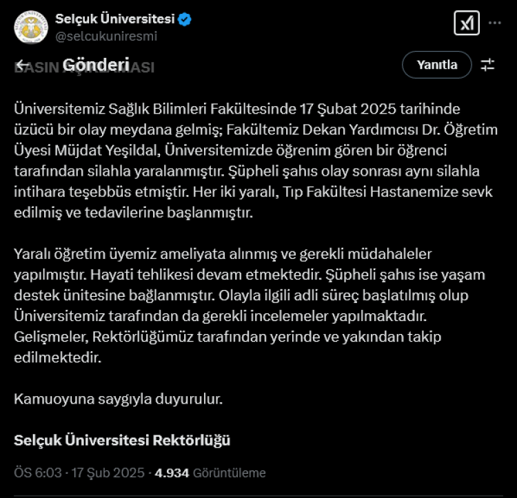 Konya Selçuk Üniversitesi Sağlık Bilimleri Fakültesi’nde yaşanan öğrenci ile Dekan Yardımcısı arasındaki silahlı yaralama ile ilgili resmi açıklama Selçuk Üniversitesi Rektörlüğü’nden geldi. Rektörlükten yapılan yazılı açıklamada, yaralı öğretim üyesinin ameliyata alınarak, gerekli müdahalelerin yapıldığı ve hayati tehlikesinin devam ettiği bildirildi.
