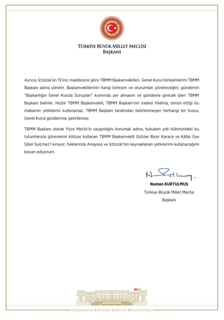 ANKARA (İGFA) – TBMM Başkanı Numan Kurtulmuş, Meclis Başkanvekili Gülizar Biçer Karaca’nın, TBMM Genel Kurulunda Anayasa Mahkemesinin (AYM), Gezi Parkı davası hükümlüsü ve milletvekilliği düşürülen Can Atalay ile ilgili karar hükmünü okutmasına ilişkin, “TBMM Başkanvekili Gülizar Biçer Karaca’nın Anayasa’ya, İçtüzük’e ve teamüllere aykırı olarak bir metni katip üyeye okutması hem yetki aşımı hem de hukuken yok hükmündedir.” ifadesini kullandı.