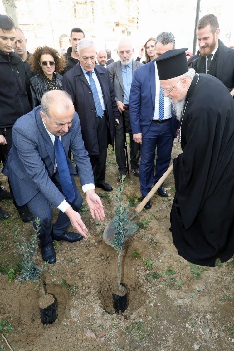 Konuşmalar sonrasında Başkan Türkyılmaz ve Patrik Bartholomeos, Tirilye’nin simge yapılarından olan Bursa Valiliği’nin kaynaklarıyla yerel belediye tarafından restore edilen Taş Mektep’in bahçesine barış ve kardeşliğin uzun sürmesi adına iki adet zeytin fidanını toprakla buluşturdu.