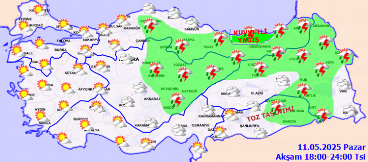 Meteoroloji, Türkiye genelinde sağanak yağış uyarısı yaptı. Orta ve Doğu Karadeniz ile Erzurum, Kars ve Ardahan’da yağışlar kuvvetli olacak. Güneydoğu Anadolu’da toz taşınımı bekleniyor.