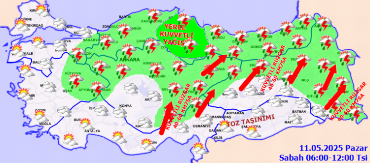 Meteoroloji, yaşanabilecek olumsuzluklara karşı kuvvetli yağış ve kuvvetli rüzgarın yanı sıra toz taşınımı uyarısında bulundu.