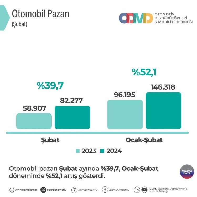 Otomobil ve hafif ticari araç pazarı ile ilgili istatistiki paylaşan ODMD verilerine göre otomobil satışları, 2024 yılı Ocak-Şubat döneminde geçen yıla göre yüzde 52,11 oranında artarak 146 bin 318 adet, hafif ticari araç pazarı yüzde 9,8 artarak 39 bin 373 adet oldu.