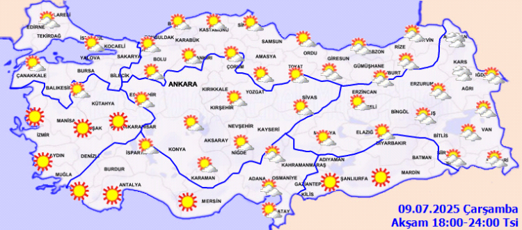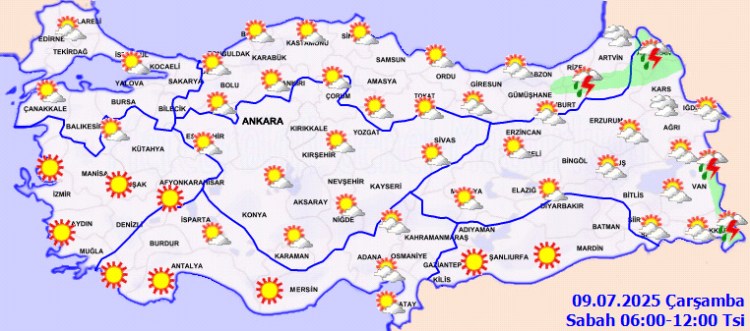 ANKARA (İGFA) – Meteoroloji Genel Müdürlüğü 9 Temmuz Çarşamba gününe ilişkin hava tahmin raporunu yayımladı.Buna göre, Kars’ın kuzeyi, Ardahan çevreleri ile öğle saatlerinden itibaren Trabzon, Rize ve Artvin’in iç kesimleri, Van ve Hakkari’nin doğusu ile Kars, Ardahan ve Ağrı çevrelerinde yerel sağanak ve gök gürültülü sağanak yağışlar görülecek.