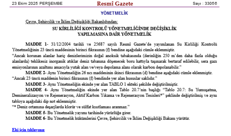 Bugünkü Resmi Gazete’de yayımlanan değişikliklerle, denizlerimizde atık bertarafı ve karbon depolama konularında yeni hükümler getirildi.