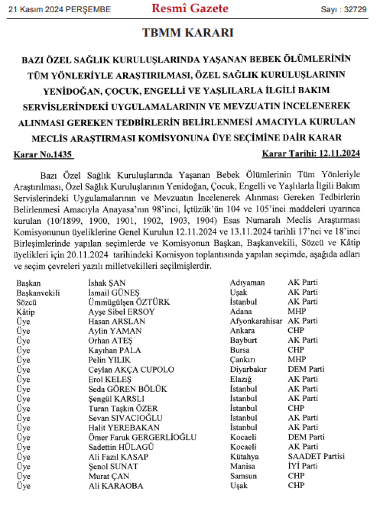 Öte yandan Bazı Özel Sağlık Kuruluşlarında Yaşanan Bebek Ölümlerinin Tüm Yönleriyle Araştırılması, Özel Sağlık Kuruluşlarının Yenidoğan, Çocuk, Engelli ve Yaşlılarla İlgili Bakım Servislerindeki Uygulamalarının ve Mevzuatın İncelenerek Alınması Gereken Tedbirlerin Belirlenmesi Amacıyla Kurulan Meclis Araştırması Komisyonuna üye seçimine ilişkin karar da yine bugünkü Resmi Gazete’de yayımlandı.