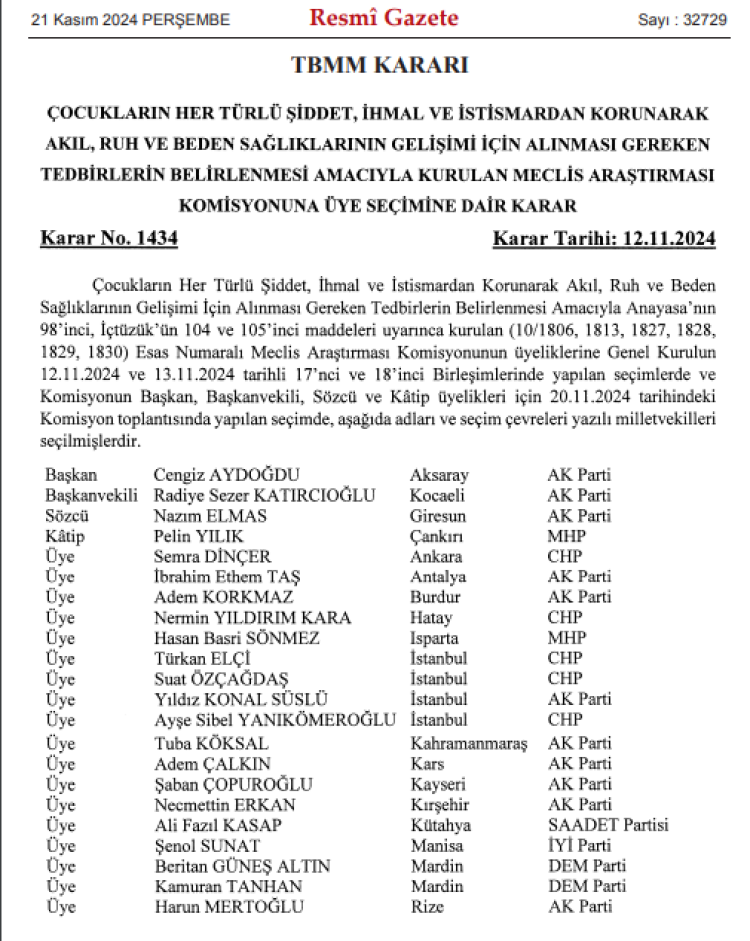 Buna göre; Çocukların Her Türlü Şiddet, İhmal ve İstismardan Korunarak Akıl, Ruh ve Beden Sağlıklarının Gelişimi İçin Alınması Gereken Tedbirlerin Belirlenmesi Amacıyla Kurulan Meclis Araştırması Komisyonu’na şu isimler katıldı.