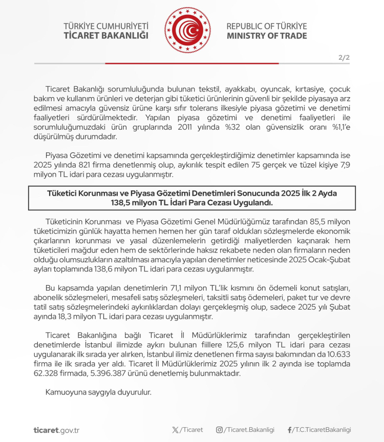 Öte yandan Tüketicinin Korunması ve Piyasa Gözetimi Genel Müdürlüğü ekiplerince yapılan denetimlere de yer verilen yazılı açıklamada, “Hem tüketicileri mağdur eden hem de sektörlerinde haksız rekabete neden olan firmaların neden olduğu olumsuzlukların azaltılması amacıyla yapılan denetimler neticesinde ocak-şubat aylarında 138,6 milyon lira idari para cezası uygulanmıştır.” ifadeleri yer aldı.