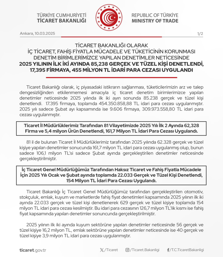 Ticaret Bakanlığı bünyesindeki İç Ticaret, Fahiş Fiyatla Mücadele ve Tüketicinin Korunması denetim birimlerince yapılan denetimlerde yılın ilk iki ayında 85 bin 238 gerçek ve tüzel kişiyi denetledi. Denetimlerde 17 bin 395 firmaya, 455 milyon TL idari para cezası uygulandı.