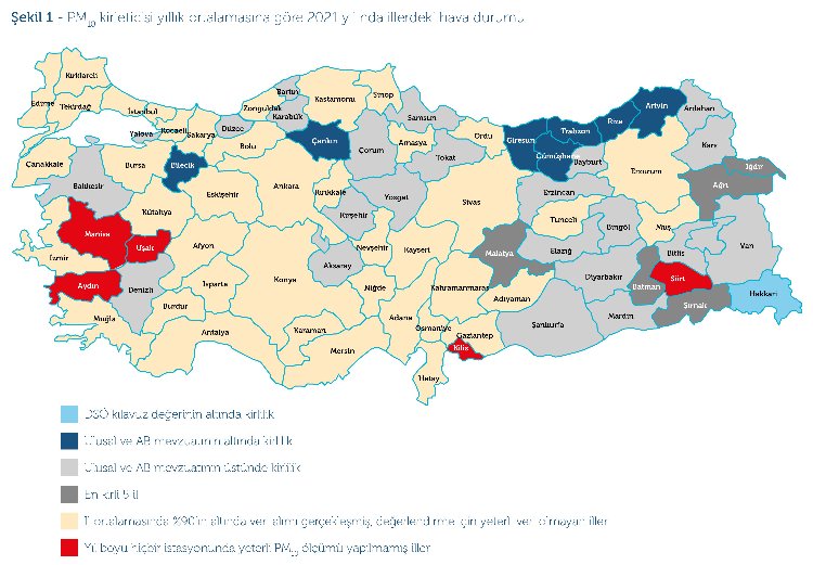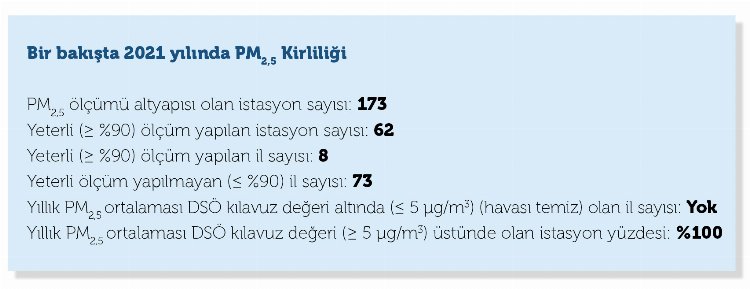 Temiz Hava Hakkı Platformu Koordinatörü Deniz Gümüşel, raporla ilgili yaptığı değerlendirmesinde, Türkiye’de 360 istasyonlu oldukça geniş bir izleme ağı bulunmasına rağmen bu istasyonlarda düzenli ölçüm yapılmadığını, 2021 yılında Türkiye’de en yaygın olarak izlenen hava kirletici parametre PM10 için bile, sadece 34 ilin kirlilik durumunu bildiklerini, bu kısıtlı veriye göre, Türkiye’de DSÖ’nün sınır değer olarak belirlediği PM 2.5 yoğunluğunun tam dört katı kirli hava soluduğumuzu söyledi.