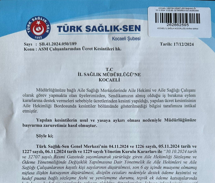 Türk Sağlık Sen Kocaeli Şube Başkanı Ömer Çeker, Aile Sağlığı Merkezleri’nde görev yapan Aile Hekimi ve Aile Sağlığı Çalışanlarını maaşlarından üç günlük kesinti yapılmasının kabul edilemez olduğunu belirterek, duruma tepki gösterdi.