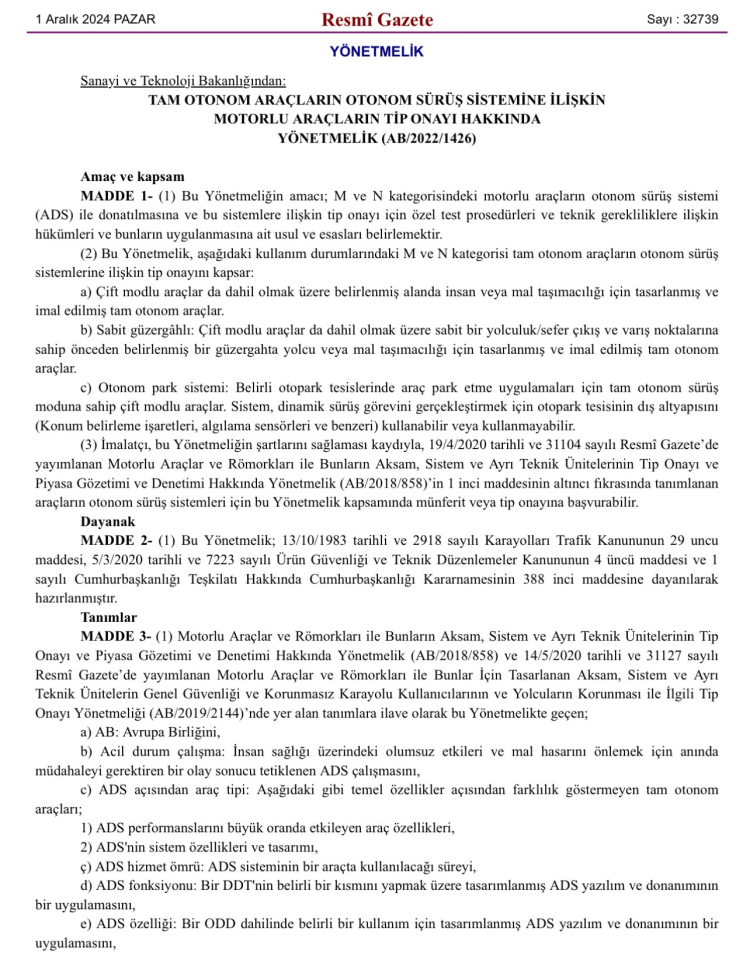 Daha önce otonom araçlarla ilgili yasal bir düzenleme bulunmazken, hazırlanan yönetmelikle, otonom araçların gereklilikleri, test prosedürleri ve onay süreçleri yasal çerçeveye oturtuldu. Düzenleme Avrupa Birliği’nin 2022/1426 sayılı tüzüğü temel alınarak hazırlanırken, M ve N kategorisindeki araçların otonom sürüş sistemlerine standart getirildi.