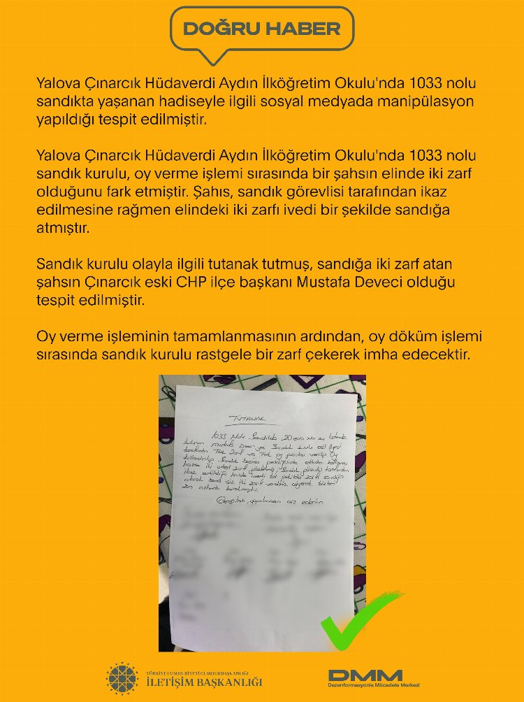 İletişim Başkanlığı Dezenformasyonla Mücadele Merkezi tarafından yapılan açıklamada, Çınarcık Hüdaverdi Aydın İlköğretim Okulu’nda 1033 nolu sandığa iki zarf atan şahsın Çınarcık CHP ilçe eski başkanı Mustafa Deveci olduğunun tespit edildiğini duyurarak, sandık kurulunun olayla ilgili tutanak tutulduğunu bildirdi.
