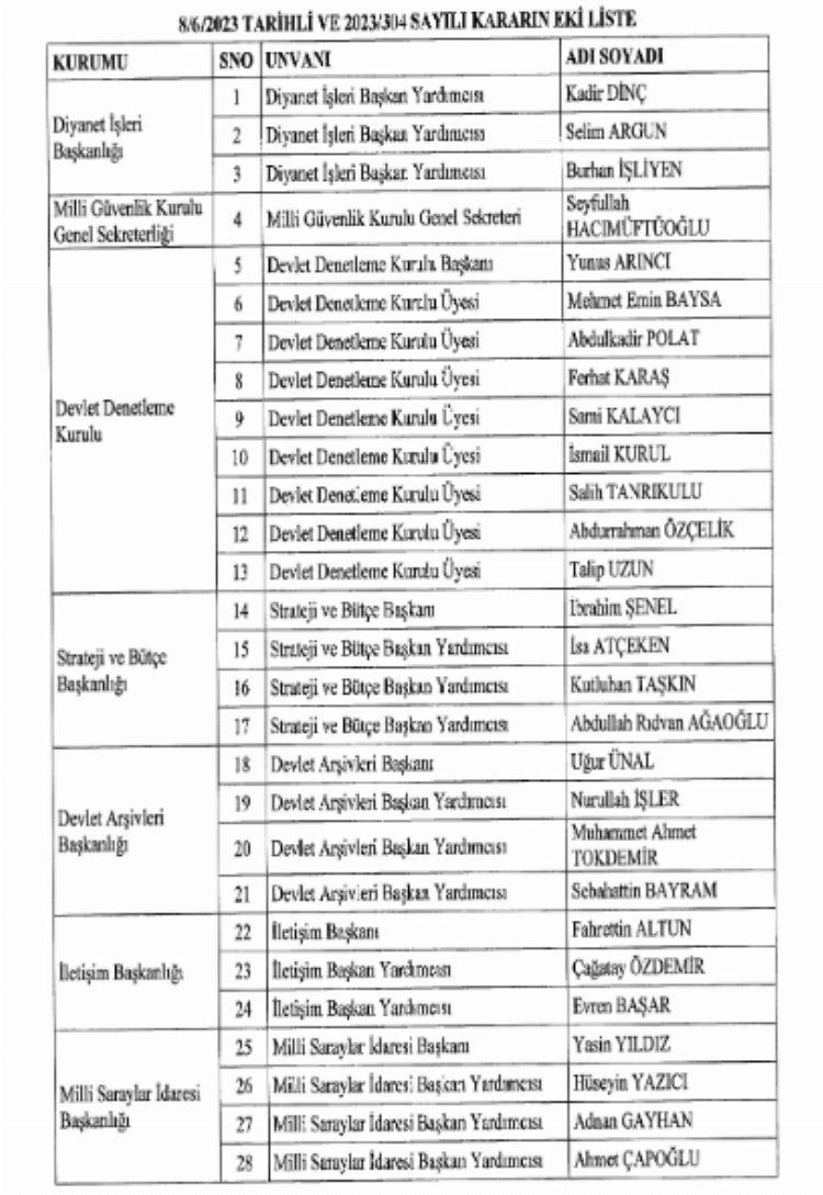 Buna göre Cumhurbaşkanlığı Teşkilatında İdari İşler Başkanı Dr. Metin Kıratlı, İletişim Başkanı Prof. Dr. Fahrettin Altun, Cumhurbaşkanlığı Özel Kalem Müdürü Doç. Dr. Hasan Doğan, Strateji ve Bütçe Başkanı İbrahim Şenel, Devlet Denetleme Kurulu Başkanı Yunus Arıncı, Devlet Arşivleri Başkanı Prof. Dr. Uğur Ünal, Milli Saraylar İdaresi Başkanı Dr. Yasin Yıldız ve Milli Güvenlik Kurulu Genel Sekreteri Seyfullah Hacımüftüoğlu yeniden aynı göreve atandı.