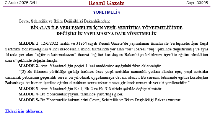 Çevre, Şehircilik ve İklim Değişikliği Bakanlığı, binalar ve yerleşmeler için verilen yeşil sertifika uygulamalarında önemli değişiklikler yaptı. Resmî Gazete’de yayımlanan yeni yönetmelik ile uzmanlık yetkisi süresi ve eğitim şartları güncellendi.