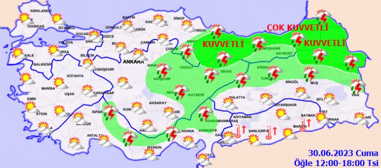 DOĞU ANADOLU KUVVETLİ YAĞIŞ UYARISI : Bugün öğle saatlerinden sonra Kars, Ardahan, Iğdır ve Ağrı çevreleri ile Erzurum’un kuzey kesimlerinde yerel kuvvetli (21-50 kg/m2) gök gürültülü sağanak yağış bekleniyor. Ani sel, su baskını, yıldırım, yerel dolu yağışı, ani kuvvetli rüzgar ve kısa süreli fırtına ile ulaşımda aksamalar gibi olumsuzluklara karşı dikkatli ve tedbirli olunmalıdır.