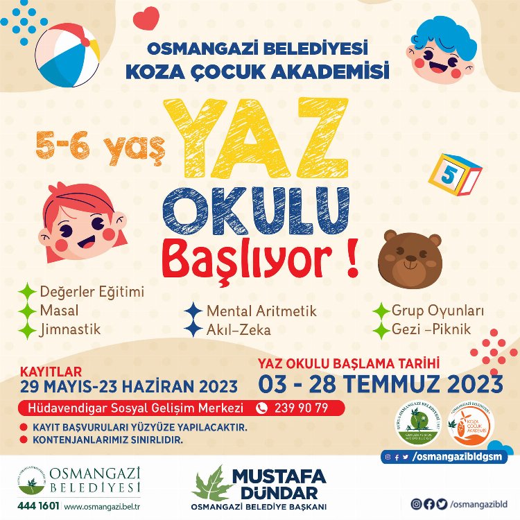 Koza Çocuk Akademi’nin yeni dönem kayıtlarının 29 Mayıs ile 23 Haziran 2023 tarihleri arasında Hüdavendigar Sosyal Gelişim Merkezi’nde yüz yüze yapılacağını duyuran Osmangazi Belediye Başkanı Mustafa Dündar, “Bizler, geleceğimizin teminatı güçlü Türkiye’mizin mimarı olacak çocuk ve gençlerimizin gelişimine katkı sağlayacak projeler ortaya koyuyoruz. Sosyal hayatın gelişimine katkı sağlayarak kültürel faaliyet alanları oluşturan Koza Çocuk Akademi’de öğrencilerimizi sevgiyle yarınlara hazırlıyoruz. Bu yıl 3 Temmuz’da başlayacak akademimiz, 28 Temmuz’da sona erecek. Vaktini değerli geçirmek isteyen tüm evlatlarımızı merkezimize davet ediyorum” dedi.
