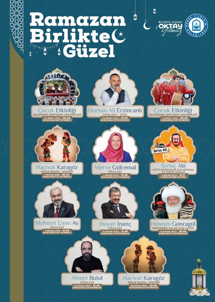 Ramazan ayı boyunca etkinlikler hem Yıldırım’da hem de kardeş şehir Malatya Yeşilyurt’ta gerçekleşecek. ‘Ramazan Birlikte Güzel’ sloganıyla önemli konukları vatandaşla buluşturacak olan Yıldırım Belediyesi, Barış Manço Kültür Merkezi’nde Dursun Ali Erzincanlı, Merve Gülcemal, Sertaç Abi, Mehmet Emin Ay, Hayati İnanç, Ahmet Bulut, Hüseyin Goncagül’ü misafir edecek ve birbirinden güzel geleneksel ramazan etkinlikleri ile minikleri eğlendirecek. Yine Ramazan ayı boyunca İlahiyatçı-Yazar Erkan Aydın ile Bursa’da İftar programı canlı yayın ile Ülke TV’de izleyiciyle buluşacak. Ayrıca konteyner kent çalışmaları devam eden Yeşilyurt’ta çalışmalarını sürdüren Yıldırım Belediyesi, bölgede kurduğu etkinlik çadırında Nurullah Genç, Abdullah Yıldız, Ali Nuri Türkoğlu, Hasan Dursun, Bahadır Yenişehirlioğlu, Beytullah Özdemir, İsmail Hakkı Ürün, Murat Belet, Hüseyin Goncagül ve ekibi, Hacivat Karagöz ile Yarışma, Ramazan Dede, Kuran’ı Kerim Tilaveti programları ile vatandaşlara ve çocuklara özel pek çok program düzenleyecek.