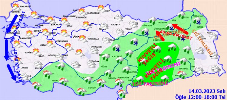 KUVVETLİ RÜZGAR UYARISI: Rüzgarın, Marmara’nın güneybatısı ve Kıyı Ege’de kuzeyli yönlerden, Doğu Karadeniz’in iç kesimlerinde güney ve güneydoğu yönlerden kuvvetli (40-60 km/saat) olarak esmesi beklendiğinden yaşanabilecek ağaç ve direk devrilmesi, çatı uçması, ulaşımda aksamalar, soba ve doğalgaz kaynaklı baca zehirlenmeleri gibi olumsuzluklara karşı dikkatli ve tedbirli olunmalıdır.